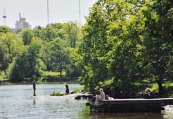 According to the European Cities Monitor 2010,[129] Stockholm is the best city in terms of freedom from pollution. Surrounded by 219 nature reserves, Stockholm has around 1,000 green spaces, which corresponds to 30% of the city's area.[130] Founded in 1995, the Royal National City Park is the world's first legally protected "national urban park".[131][132] For a description of the formation process, value assets and implementation of the legal protection of The Royal National Urban Park, see Schantz 2006 The water in Stockholm is so clean that people can dive and fish in the centre of the city.[130] The waters of downtown Stockholm serve as spawning grounds for multiple fish species including trout and salmon, though human intervention is needed to keep populations up.[133] Regarding CO