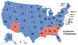 The Republicans officially became the party of interventionist foreign policy during the Vietnam War, where "Hawks were more likely to be older and Republican or Southern Democrats."[158] Lyndon Johnson had already appealed to the anti-Vietnam crowd during the 1964 Presidential Election through portraying Goldwater as somebody who would escalate the conflict, even possibly using nuclear weapons.[159][note 17] The 1968 Presidential Election also saw anti-Vietnam candidates such as Eugene McCarthy[160] and Robert F. Kennedy[161] seeing massive success, to the point where riots infamously occurred during that year's Democratic Convention due to the failure of McCarthy to get the nomination.[162][note 18]