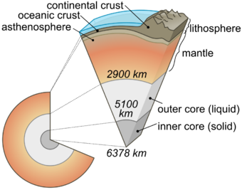 Average oceanic lithosphere is typically 100 km (62 mi) thick.[10] Its thickness is a function of its age. As time passes, it cools by conducting heat from below, and releasing it raditively into space. The adjacent mantle below is cooled by this process and added to its base. Because it is formed at mid-ocean ridges and spreads outwards, its thickness is therefore a function of its distance from the mid-ocean ridge where it was formed. For a typical distance that oceanic lithosphere must travel before being subducted, the thickness varies from about 6 km (4 mi) thick at mid-ocean ridges to greater than 100 km (62 mi) at subduction zones. For shorter or longer distances, the subduction zone, and therefore also the mean, thickness becomes smaller or larger, respectively.[11] Continental lithosphere is typically about 200 km thick, though this varies considerably between basins, mountain ranges, and stable cratonic interiors of continents.