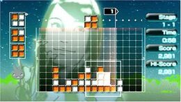 Lumines II uses the same core gameplay of its predecessor Lumines with new features included.[1] The objective is to move, rotate, and drop blocks to form 2×2 squares or larger of the same color (referred to as a colored square). A vertical line known as the Time Line sweeps across the field from left to right and erase the colored squares; awarding points to the players' overall score. Erasing four or more squares will add a bonus multiplier to the players' overall score. Players lose when the blocks reach the top of the board.[2]