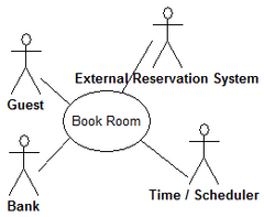 | Guest | Guest requests a room of a certain type, for a particular arrival date, departure date, at a certain rate, etc. | booking request + (payment validation) + (*external reservation system* booking confirmation) [5] |