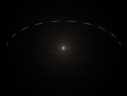 On the puppeteer home world, they are told that the expedition's goal is to investigate the Ringworld,[3] a gigantic artificial ring, to see if it poses any threat. The Ringworld is about one million miles (1.6 million km) wide and approximately the diameter of Earth's orbit (which makes it about 584.3 million miles or 940.4 million km in circumference), encircling a sunlike star. It rotates to provide artificial gravity 99.2% as strong as Earth's from centrifugal force. The Ringworld has a habitable, flat inner surface (equivalent in area to approximately three million Earths), a breathable atmosphere and a temperature optimal for humans. Night is provided by an inner ring of shadow squares which are connected to each other by thin, ultra-strong wire. When the crew completes their mission, they will be given the starship in which they travelled to the puppeteer home world; it is orders of magnitude faster than any possessed by humans or Kzinti.