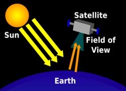 Nadir also refers to the downward-facing viewing geometry of an orbiting satellite,[4] such as is employed during remote sensing of the atmosphere, as well as when an astronaut faces the Earth while performing a spacewalk. A nadir image is a satellite image or aerial photo of the Earth taken vertically. A satellite ground track represents its orbit projected to nadir on to Earth's surface.