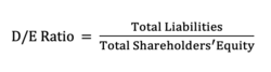 The D/E ratio is a leverage ratio which determines how much debt a company uses to finance its assets.[28] It evaluates the company’s financial leverage by dividing total liabilities by shareholder equity. This ratio is used in corporate finance as it measures the degree the company is financing its operations through debt or their own funding. It also gives insight on the ability of shareholder equity to cover outstanding debt in case the business fails.[30]