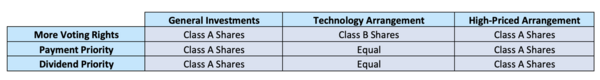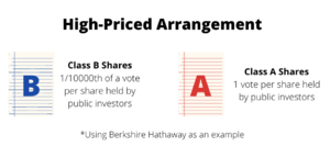 Some companies value their Class A shares at extremely high prices. Although these Class A shares are publicly owned and traded on the market, they are generally out of reach for the typical investor. In these cases, firms create Class B shares which trade at a mere fraction of the Class A’s share. The Class B share, however, has only a small fraction of voting power. These companies create both share classes in a way where price and voting power are not proportional. One example of this arrangement is the Berkshire Hathaway structure.[32]