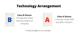 The technology class arrangement derived its name from its popularity amongst technology companies. It usually involves insiders of a company having control over their Class B shares. The Class B shares have about 10 times the voting power of Class A shares, and are not traded on public exchanges. These shares are called "super-voting shares" as they give key company insiders larger control over the company which includes its board and is usually the deciding factor for corporate actions.[33] Hence, the "super-voting shares" are usually not publicly traded.[34] One popular example would be the” Google Share Class Structure”.[32] The purpose of this structure is argued to ensure stability of the company and prevent the board and management from feeling short-term pressure, which in turn allows them to focus on long-term goals.[35]