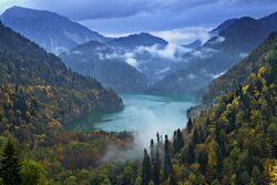 Abkhazia covers an area of about 8,665 km2 (3,346 sq mi) at the western end of Georgia.[36][155][156] The Caucasus Mountains to the north and northeast separate Abkhazia and the Russian Federation. To the east and southeast, Abkhazia is bounded by the Georgian region of Samegrelo-Zemo Svaneti; and on the south and southwest by the Black Sea. Abkhazia is diverse geographically with lowlands stretching to the extremely mountainous north. The Greater Caucasus Mountain Range runs along the region's northern border, with its spurs – the Gagra, Bzyb and Kodori ranges – dividing the area into a number of deep, well-watered valleys. The highest peaks of Abkhazia are in the northeast and east and several exceed 4,000 metres (13,123 ft) above sea level. Abkhazia's landscape ranges from coastal forests and citrus plantations to permanent snows and glaciers in the north of the region. Although Abkhazia's complex topographic setting has spared most of the territory from significant human development, its cultivated fertile lands produce tea, tobacco, wine and fruits, a mainstay of the local agricultural sector. Abkhazia is richly irrigated by small rivers originating in the Caucasus Mountains. Chief of these are: Kodori, Bzyb, Ghalidzga, and Gumista. The Psou River separates the region from Russia, and the Inguri serves as a boundary between Abkhazia and Georgia proper. There are several periglacial and crater lakes in mountainous Abkhazia. Lake Ritsa is the most important of them.