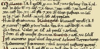 Mollande tempore regis Edwardi geldabat pro quattuor hidis et uno ferling. Terra est quadraginta carucae. In dominio sunt tres carucae et decem servi et triginta villani et viginti bordarii cum sedecim carucis. Ibi duodecim acrae prati et quindecim acrae silvae. Pastura tres leugae in longitudine et latitudine. Reddit quattuor et viginti libras ad pensam. Huic manerio est adjuncta Blachepole. Elwardus tenebat tempore regis Edwardi pro manerio et geldabat pro dimidia hida. Terra est duae carucae. Ibi sunt quinque villani cum uno servo. Valet viginti solidos ad pensam et arsuram. Eidem manerio est injuste adjuncta Nimete et valet quindecim solidos. Ipsi manerio pertinet tercius denarius de Hundredis Nortmoltone et Badentone et Brantone et tercium animal pasturae morarum.
