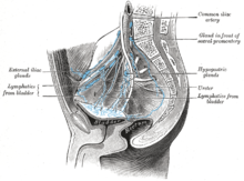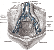 The most common sites for bladder cancer metastases are the lymph nodes, bones, lung, liver, and peritoneum.[76] The most common sentinel lymph nodes draining bladder cancer are obturator and internal iliac lymph nodes. The location of lymphatic spread depends on the location of the tumors. Tumors on the superolateral bladder wall spread to external iliac lymph nodes. Tumors on the neck, anterior wall and fundus spread commonly to the internal iliac lymph nodes.[77] From the regional lymph nodes (i.e. obturator, internal and external lymph nodes) the cancer spreads to distant sites like the common iliac lymph nodes and paraaortic lymph nodes.[78] Skipped lymph node lesions are not seen in bladder cancer.[77]