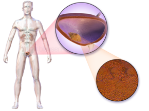 Bladder cancer is any of several types of cancer arising from the tissues of the urinary bladder.[1] It is a disease in which cells grow abnormally and have the potential to spread to other parts of the body.[6][7] Symptoms include blood in the urine, pain with urination, and low back pain.[1]