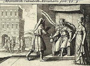 Genesis 20:1-16 narrates the story of Abraham emigrating to the southern region of Gerar, whose king is named Abimelech. Abraham states that Sarah, his wife, is really his sister, leading Abimelech to try to take Sarah as a wife; however, God intervened before Abimelech touched Sarah. Abimelech complains to Abraham, who states that Sarah is his half-sister.