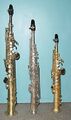 B♭soprano saxophone (left), C soprano saxophone (center), E♭sopranino saxophone (right)