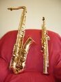 A tenor and soprano saxophone (on the right) made from phosphor bronze, showing their comparative sizes