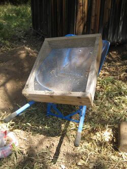 A riddle may be square, rectangular or circular in shape, with a rim made from wood, metal, plastic or beechwood, holding in place a steel wire mesh that may either be handwoven or machine-made. A typical circular riddle is approximately 18 inches (46 cm) in diameter and the mesh may have a spacing of something like 1 1⁄2 inches (3.8 cm), 1 inch (2.5 cm), 5⁄8 inch (1.6 cm), 1⁄2 inch (1.3 cm), or 3⁄8 inch (0.95 cm).[2]