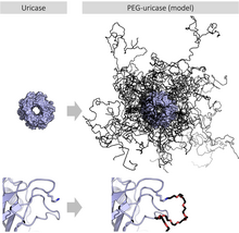 The protein uricase can be PEGylated to form pegloticase, which improves its solubility at physiological pH, increases serum half-life and reduces immunogenicity without compromising activity. Upper images show the whole tetramer, lower images show one of the lysines that is PEGylated. (PDB: 1uox PEG-uricase model from reference[31])