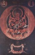 Yab-Yum of Samantabhadra ("All Good," the Primordial Buddha) and his female aspect of consort, Samantabhadrī (17th century). The erotic union symbolizes, respectively, the non-duality of Compassion (or Method) and Wisdom; or also of Form and Emptiness.[1][2][3]