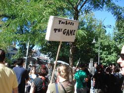 The Game has been described as challenging and fun to play, and as pointless, childish, and infuriating.[4] In some Internet forums, such as Something Awful and GameSpy, and in several schools, The Game has been banned.[7][10]