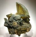 Yellow-green titanite twinned crystal perched vertically on the matrix