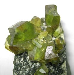 ![]() Titanite crystals on amphibole (image width 2 mm) | |