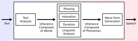 A text-to-speech system (or "engine") is composed of two parts:[3] a front-end and a back-end. The front-end has two major tasks. First, it converts raw text containing symbols like numbers and abbreviations into the equivalent of written-out words. This process is often called text normalization, pre-processing, or tokenization. The front-end then assigns phonetic transcriptions to each word, and divides and marks the text into prosodic units, like phrases, clauses, and sentences. The process of assigning phonetic transcriptions to words is called text-to-phoneme or grapheme-to-phoneme conversion. Phonetic transcriptions and prosody information together make up the symbolic linguistic representation that is output by the front-end. The back-end—often referred to as the synthesizer—then converts the symbolic linguistic representation into sound. In certain systems, this part includes the computation of the target prosody (pitch contour, phoneme durations),[4] which is then imposed on the output speech.