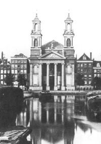 Spinoza was buried in the Nieuwe Kerk (New Church) on the Spui four days after his death, on 25 February, inside the church, with six others in the same vault. At the time there was no memorial plaque for Spinoza. In the 18th century, the vault was emptied and the remains disposed of, with the "remnants scattered over the earth of the churchyard." The memorial plaque visitors now see is outside, where some of his remains are part of the churchyard's soil.[86]