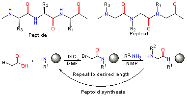 Following the sub-monomer protocol originally created by Ron Zuckermann,[4] each residue is installed in two steps: acylation and displacement. In the acylation step, a haloacetic acid, typically bromoacetic acid activated by diisopropylcarbodiimide reacts with the amine of the previous residue. In the displacement step (a classical SN2 reaction), an amine displaces the halide to form the N-substituted glycine residue. The submonomer approach allows the use of any commercially available or synthetically accessible amine with great potential for combinatorial chemistry.