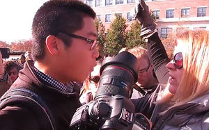 That same day, student photographer Tim Tai clashed with student protesters. These protesters, who had gathered in a public space on campus, repeatedly asked Tai to leave the area. Tai refused, asserting his First Amendment press rights. Student journalist Mark Schierbecker filmed the incident. Shortly after the confrontation between Tai and the protesters, assistant professor of communications Melissa Click accosted Schierbecker. According to a video of the incident, Click demanded that Schierbecker leave the area. Schierbecker refused, at which point Click called out, "Who wants to help me get this reporter out of here? I need some muscle over here." Critics denounced the exchange as an assault on the freedom of the press. Others, however, argued that the journalists, while within their legal rights, conducted themselves poorly during these exchanges.[23]