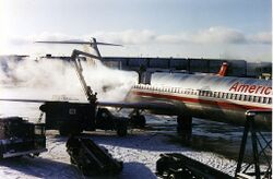 De-icers spray heated de-icing fluid, most often using propylene glycol (formerly ethylene glycol was used), onto icy surfaces such as the bodies of aircraft and road surfaces.[30] These prevent ice from forming on the body of the aircraft while on the ground. Ice makes the surface of the wings rougher, reducing the amount of lift they provide while increasing drag. The ice also increases the weight of the aircraft and can affect its balance.