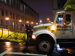 Other common changes include the replacement of the factory stock tires with rain tires or mud and snow tires and the shortening of the vehicle's wheelbase to improve maneuverability.[12] For smaller applications smaller trucks are used. In Canada, pickup trucks are used with snow removal operations with a blade mounted in front and optional de-icing equipment installed in the rear. Underbody scrapers are also used by some agencies and are mounted between axles, distributing plowing stresses on the chassis more evenly.[13]