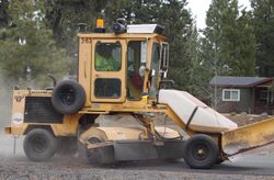 A snow sweeper uses brushes to remove thin layers of snow from the pavement surface. Snow sweepers are used after plowing to remove any remaining material missed by the larger vehicles in areas with very low snow-tolerance, such as airport runways and racing tracks,[54] as the flexible brushes follow the terrain better than the rigid blades of snowplows and snow blowers.[55] These brushes also allow the vehicle to be used on the tactile tiles found at traffic lights and tram stops, without damaging the delicate surface.[56] Unlike other winter service vehicles, snow sweepers do not compress the snow, leaving a rough, high friction, surface behind them. This makes snow sweepers the most efficient method of snow removal for snow depths below 10 centimetres (3.9 in).[57] Snow deeper than this, however, can clog the brushes, and most snow sweepers cannot be used to clear snow deeper than 15 centimetres (5.9 in).[55] A more advanced version of the snow sweeper is the jet sweeper, which adds an air-blower just behind the brushes, in order to blow the swept snow clear of the pavement and prevent the loosened snow from settling.[54]