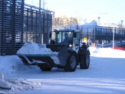 In the event that specially designed winter service vehicles are not available for plowing, other service or construction vehicles can be used instead: among those used by various authorities are graders,[24] bulldozers,[50] skid loaders,[51] pickup trucks and rubbish trucks.[52] Front-end loaders can also be used to plow snow. Either a snowplow attachment can be mounted on the loader's arm in place of the bucket, or the bucket or snowbasket can be used to load snow into the rear compartment of a snowplow or dump truck, which then hauls it away.[53] Snowplows are dangerous to overtake; often, the oncoming lane may not be completely free of snow. In addition, the plow blade causes considerable spray of snow on both sides, which can obscure the vision of other road users.[3]