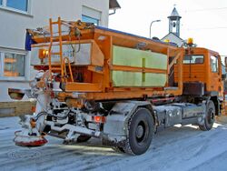 A winter service vehicle (WSV), or snow removal vehicle, is a vehicle specially designed or adapted to clear thoroughfares of ice and snow.[1][2][3] Winter service vehicles are usually based on a dump truck chassis, with adaptations allowing them to carry specially designed snow removal equipment. Many authorities also use smaller vehicles on sidewalks, footpaths, and cycleways. Road maintenance agencies and contractors in temperate or polar areas often own several winter service vehicles, using them to keep the roads clear of snow and ice and safe for driving during winter.[4][5] Airports use winter service vehicles to keep both aircraft surfaces, and runways and taxiways free of snow and ice, which, besides endangering aircraft takeoff and landing, can interfere with the aerodynamics of the craft.[6][7]