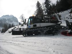 A snow groomer is a machine designed to smooth and compact the snow, rather than removing it altogether. Early snow groomers were used by residents of rural areas to compress the snow close to their homes,[43] and consisted of a heavy roller hauled by oxen which compacted the snow to make a smooth surface for sledging.[8] With the invention of the motor car, snow groomers were replaced by snowplows and snow blowers on public thoroughfares, but remained in use at ski resorts, where they are used to maintain smooth, safe trails for various wintersports, including skiing, snowboarding and snowmobiling. Snow groomers remained unchanged throughout the 20th century, with most consisting of heavy roller which could be attached to a tractor or snowcat and then hauled across the area to be groomed.[44]