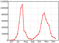Swine flu cases per week in the United Kingdom in 2009; schools typically close for summer in mid-July and re-open in early September.