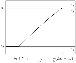 Using the above global regularization procedure, the global solution to the KdV Whitham equations with initial data in eq. (14) is a self-similar rarefaction wave solution (depending only on \(x/t\)) satisfying \[ r_1(x,t) = u_r, \quad r_2(x,t) = \left \{ \begin{array}{cc} u_r & x/t < v_- \\ r(x/t) & v_- < x/t < v_+ \\ u_l & v_+ < x/t \end{array} \right ., \quad r_3(x,t) = u_l, \] where \(r(x/t)\) satisfies the implicit relation \[ v_2(u_r,r(x/t),u_l) = x/t . \] For a plot of the solution, see Figure 4. The trailing and leading edge front speeds are determined by studying the limiting behaviors \(r \to u_r^+\) and \( r \to u_l^-\) of Eq. (12), respectively \[ v_- = \lim_{r \to u_r^+} v_2(u_r,r,u_l) = -u_l + 2u_r, \] \[ \quad v_+ = \lim_{r \to u_l^-} v_2(u_r,r,u_l) = \frac{1}{3}(2u_l + u_r) . \]