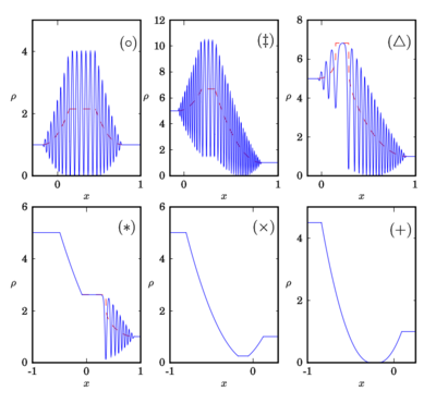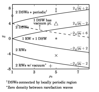 In general, the solution consists of two waves which are rarefaction waves (RWs) or dispersive shock waves (DSWs). For example, the case \(\ast\) in Figure 7 and Figure 8 corresponds to the so-called shock tube problem where there is an initial jump in density but zero initial fluid velocity. The leading order solution is a rarefaction wave propagating to the left and a dispersive shock wave propagating to the right. Both types of waves are called simple waves because only one Riemann invariant changes across the wave. In the case of a rarefaction wave, one of \(r_\pm\) changes while the other is constant. For a dispersive shock wave, one of the \(r_i\ ,\) \(i = 1, ~ 2, ~ 3,\) or \(4\) varies while the rest are constant. It can be shown by a dispersive regularization that the behavior of the solution depends on the relative ordering of the four values \[ u_0 \pm 2\sqrt{\rho_0}, \quad \pm 2 , \] which are precisely the values of the Euler Riemann invariants \(r_\pm\) in eq. (21) evaluated at the initial data in eq. (22). There are five possible orderings of these values leading to five qualitatively different solution behaviors which are shown in Figure 7 and Figure 8. For sufficiently small initial velocities \(u_0 \le -2\sqrt{\rho_0}+2\) (cases \(\times\) and \(+\) in Figure 7, Figure 8), there are no shock waves in the solution, only rarefaction waves. For sufficiently large velocities \(u_0 > 2\sqrt{\rho_0} + 2\) (cases \(\circ\) and \(\ddagger\) in Figure 7, Figure 8), the asymptotic solution consists of two dispersive shock waves connected by a periodic wavetrain.