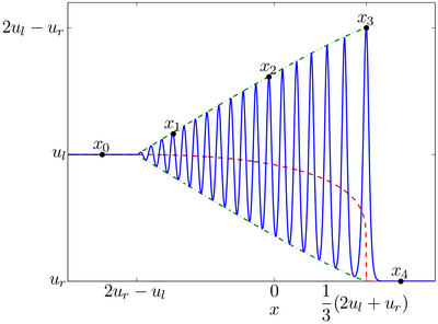 \[\tag{2} u(x,0) = \left \{ \begin{array}{cc} u_l & x < 0 \\ u_r & x > 0 \end{array} \right ., \quad \varepsilon^2 \ll 1 . \]