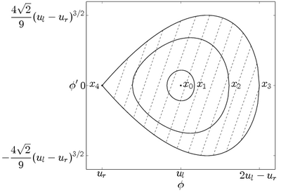 It is also possible to interpret the KdV DSW from a dynamical systems perspective. Five points on the DSW shown in Figure 5 \(x_i\ ,\) \(i=0,1,2,3,4\) correspond to five different phase portraits in Figure 6. Due to the two-scale nature of the DSW, in the vicinity of each point \(x_i\ ,\) the DSW in Eq. (15) is approximately the exact, periodic solution \(\tilde{\phi}\) in Eq. (5) with the parameters \(\vec{r}\) determined by the solution to the Whitham equations. Once the solution to the Whitham equations is determined, a phase space corresponding to this family of periodic orbits can be associated with the DSW and visualized via phase portraits shown in Figure 6. The solution at the points \(x_0\) and \(x_4\) in Figure 5 correspond to fixed points in Figure 6. The points \(x_1\) and \(x_2\) correspond to periodic orbits and the point \(x_3\) corresponds to a homoclinic orbit, the KdV soliton. Since these phase portraits progressively expand as one moves through the DSW from small amplitude oscillations at the trailing edge to the soliton at the leading edge, the phase space associated with a DSW encompasses all the solution curves enclosed by the soliton homoclinic orbit.
