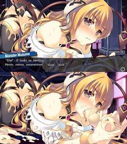 An example comparison of in-game imagery censored in the western release due to sexual themes. The bottom image depicts the original Japanese version featuring an enemy boss performing fellatio on a "spirit" while being covered in a mystery fluid, while the top image shows the expurgated western version with the lewd elements removed.