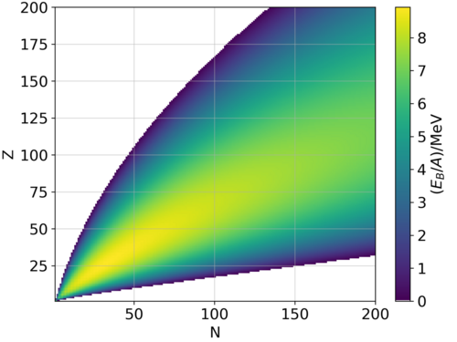For a nucleus with A nucleons, including Z protons and N neutrons, a semi-empirical formula for the binding energy (EB) per nucleon is: [math]\displaystyle{ \frac{E_\text{B}}{A \cdot \text{MeV}} = a - \frac{b}{A^{1/3}} - \frac{c Z^2}{A^{4/3}} - \frac{d \left(N - Z\right)^2}{A^2} \pm \frac{e}{A^{7/4}} }[/math] where the coefficients are given by: [math]\displaystyle{ a = 14.0 }[/math]; [math]\displaystyle{ b = 13.0 }[/math]; [math]\displaystyle{ c = 0.585 }[/math]; [math]\displaystyle{ d = 19.3 }[/math]; [math]\displaystyle{ e = 33 }[/math].