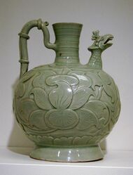Eventually, porcelain and the expertise required to create it began to spread into other areas of East Asia. During the Song dynasty (960–1279 CE), artistry and production had reached new heights. The manufacture of porcelain became highly organised, and the dragon kilns excavated from this period could fire as many as 25,000 pieces at a time,[22] and over 100,000 by the end of the period.[23] While Xing ware is regarded as among the greatest of the Tang dynasty porcelain, Ding ware became the premier porcelain of the Song dynasty.[24] By the Ming dynasty, production of the finest wares for the court was concentrated in a single city, and Jingdezhen porcelain, originally owned by the imperial government, remains the centre of Chinese porcelain production.