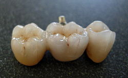 Dental porcelain is used for crowns, bridges and veneers. A formulation of dental porcelain is 70-85% feldspar, 12-25% quartz, 3-5% kaolin, up to 15% glass and around 1% colourants.[76]
