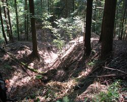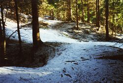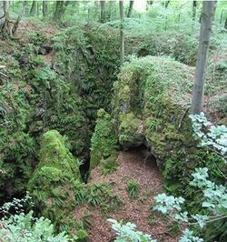 A Stollenpinge is caused by the collapse of parts of a mining gallery (Stollen) that is usually located at levels close to the surface or in weathered rock. They are generally easily recognizable from their typical asymmetrical shape and their shape of the depression which, unlike Pingen caused by excavations, is normally greater on the uphill side as well as their rather large mounds.[18]