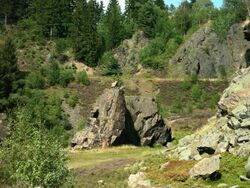 A Schachtpinge ("shaft pinge") is a particular type of Pinge caused by the collapsing of old surface mineshafts. Especially in the early days of mining, very many smaller mineshafts were sunk.[14] The shafts were predominantly lined with mine timber. Only in rare cases was natural stone, brick or concrete used for this purpose.[15] If these wells were then abandoned, the wooden lining rotted over the years, fell away and then the pit collapsed, leading to the formation of a Schachtpinge.[14] The diameter and depth of a Schachtpinge depends on the size of the shafts, and whether the shaft had been filled in and the quality of the infill.[16] Another cause for the emergence of a Schachtpinge was so-called Duckelbau mining. In this type of mining, the overburden in the area of the shaft usually collapsed very quickly, because ore was dug out just a few metres below the surface and, in most cases, not in solid rock.[17]