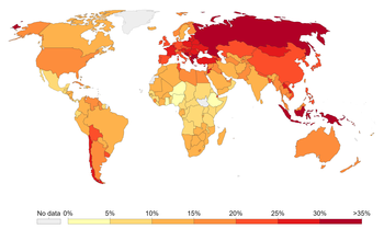 From 1965 to 2006, rates of smoking in the United States have declined from 42% to 20.8%.[38] A significant majority of those who quit were professional, affluent men. Despite this decrease in the prevalence of consumption, the average number of cigarettes consumed per person per day increased from 22 in 1954 to 30 in 1978. This paradoxical event suggests that those who quit smoked less, while those who continued to smoke moved to smoke more light cigarettes.[39] This trend has been paralleled by many industrialized nations as rates have either leveled-off or declined. In the developing countries, however, tobacco consumption continues to rise at 3.4% in 2002.[40] In Africa, smoking is in most areas considered to be modern, and many of the strong adverse opinions that prevail in the West receive much less attention.[41] Today Russia leads as the top consumer of tobacco followed by Indonesia, Laos, Ukraine, Belarus, Greece, Jordan, and China.[42]