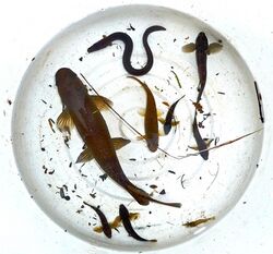 Three species of native geckos have been seen on Karioi. Auckland green geckos (see also nautilus) were common on Karioi before possums arrived. Although brightly coloured and active during the day, they are very well camouflaged and hard to spot in the manuka and kanuka where they mainly live. forest geckos and Pacific geckos are usually on the ground and active at night.[32]