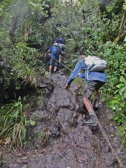 Climbing up from the car park is a DOC track to the 756 m (2,480 ft) top of Karioi. The signposted times of 2 hours to the 706 m (2,316 ft) Lookout and 3 hours to the summit allow fit walkers time for admiring the views, but on a good day it is well worth taking at least that time. The track is clearly marked and clear on the ground, but gets progressively harder, including a ladder and 2 chains. About halfway up, just before the first chain and ladder, is a good view point. Other steps and chains would be useful, especially after wet weather, but there are plenty of tree roots to grasp hold of on the other shorter near vertical sections. In most weather ordinary stout shoes suffice with some care around the few boggy sections on the summit ridge.