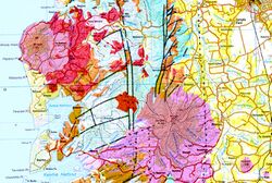 Karioi is an extinct late Pliocene, low angle cone or shield volcano of the Alexandra Volcanic Group. It is the oldest and westernmost of the Alexandra lineament of volcanoes. Two million years ago Karioi was probably an ash cone, maybe double and at least 100 m (330 ft) higher than the present 756 m (2,480 ft). It consists largely of basalt with andesite dikes, which mainly form the ridges. They pushed their way through the older limestones, mudstones, etc. about 2.4 million years ago. The main chemicals are silica (47-60%) and alumina (12-20%)[20]