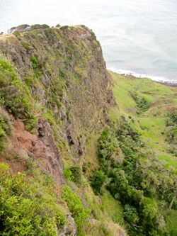 Fifteen lava flows make up the 150 m (490 ft) cliffs of the Gorge showing many large augite crystals (phenocrysts) up to 15 mm (0.59 in). Columnar basalt rests on lapilli tuffs.[21] The coastal terrace, above the boulder beach, has remnants of the contact between the early volcanic cones of Karioi and a shallow sea margin, with shells and carbonised logs exposed.[22] Mainly on the north side of the gorge are remnants of Māori stone gardens.[23] There is a steep unmarked track into the Gorge off the road to Raglan a few metres from the car park. A route also exists around the foot of the cliff south from the Gorge,[24] though it is not publicised due to a rock fall risk.