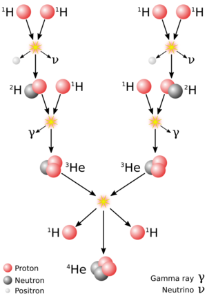 In the cores of lower-mass main-sequence stars such as the Sun, the dominant energy production process is the proton–proton chain reaction. This creates a helium-4 nucleus through a sequence of reactions that begin with the fusion of two protons to form a deuterium nucleus (one proton plus one neutron) along with an ejected positron and neutrino.[22] In each complete fusion cycle, the proton–proton chain reaction releases about 26.2 MeV.[22] The proton–proton chain reaction cycle is relatively insensitive to temperature; a 10% rise of temperature would increase energy production by this method by 46%, hence, this hydrogen fusion process can occur in up to a third of the star's radius and occupy half the star's mass. For stars above 35% of the Sun's mass,[23] the energy flux toward the surface is sufficiently low and energy transfer from the core region remains by radiative heat transfer, rather than by convective heat transfer.[24] As a result, there is little mixing of fresh hydrogen into the core or fusion products outward.